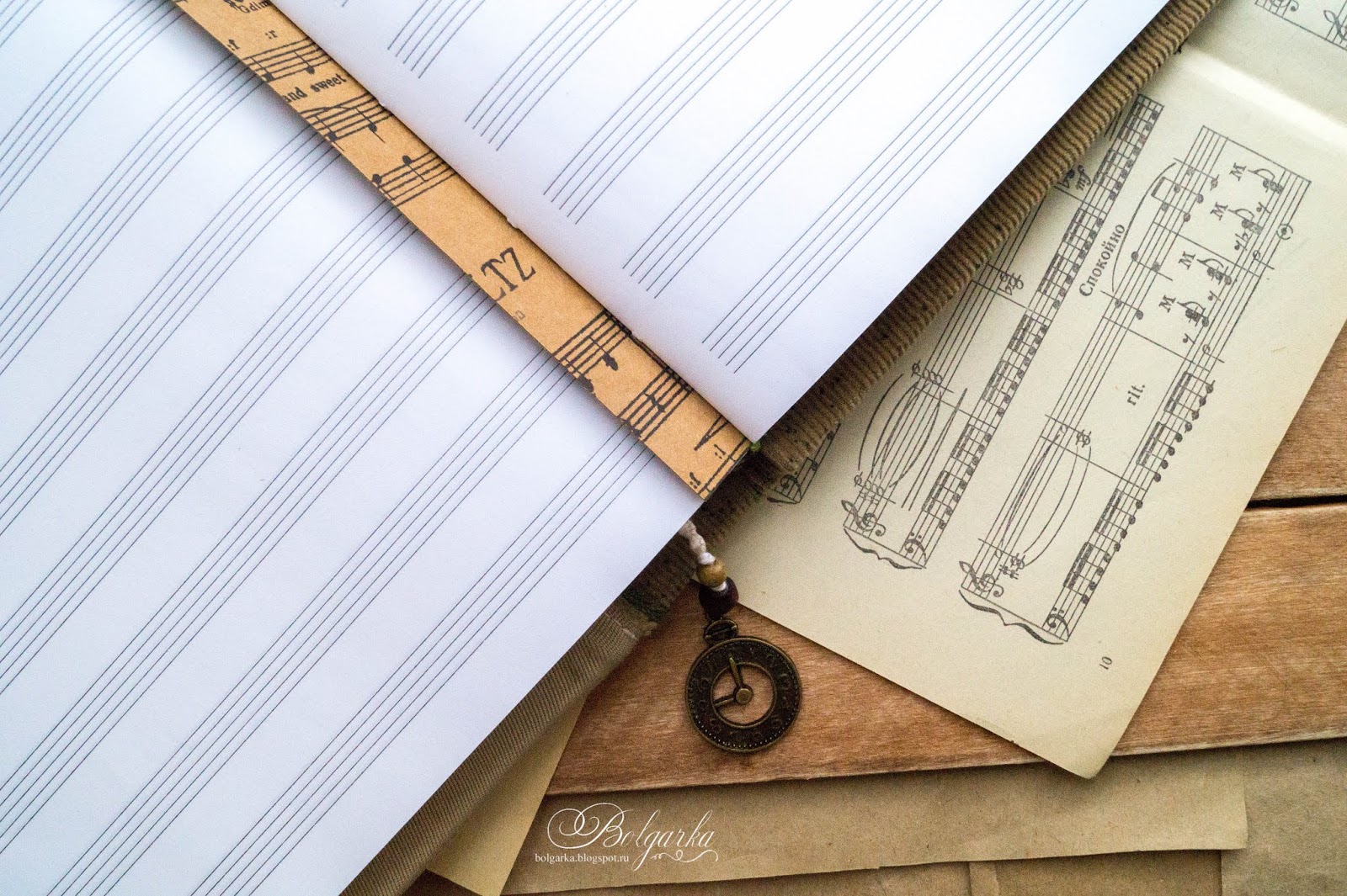Необычный формат блокнота, а в данном случае - это и вовсе нотная книга. В расход ушло 6 нотных тетрадей. Где-то слышала, что переплетать блокнот формата А4 шибко сложно. Ну не знаю, у меня очень даже нормально всё прошло. Куда заковырестее шёл процесс с крохотными блокнотиками-подвесками. Как всегда всё познаётся в сравнении.